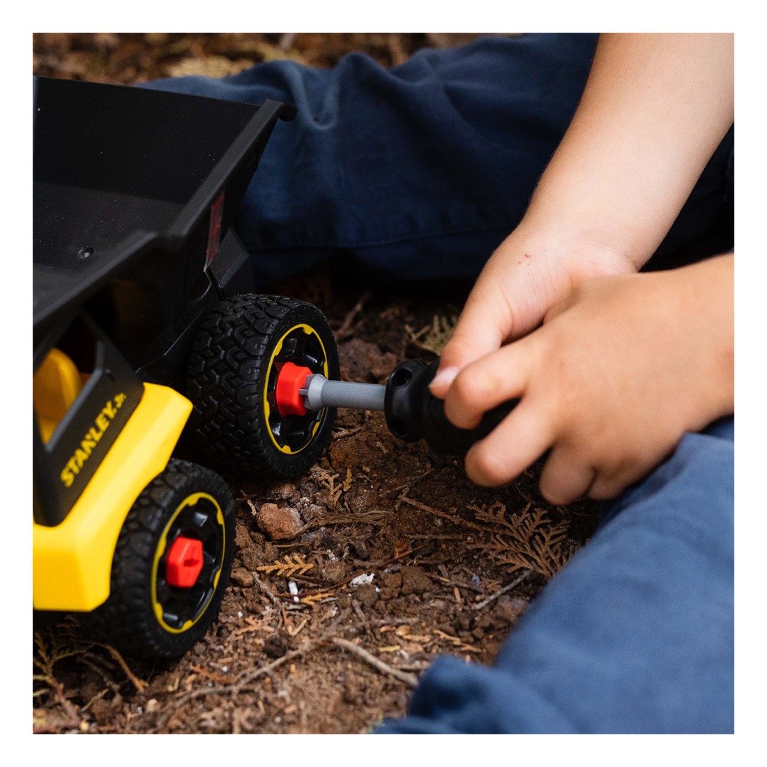 El Camión Volquete Desmontable 19pcs Stanley Jr es un vehículo clásico desmontable estilo “Take Apart”, diseñado para niños. Permite armar y desarmar sus piezas, fomenta la motricidad fina, la lógica y el juego imaginativo.