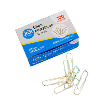 Set de 100 clips metálicos de 50 mm, medidas 5 x 1 cm. Presentación caja de cartón medidas 8,5 x 6 x 3 cm.