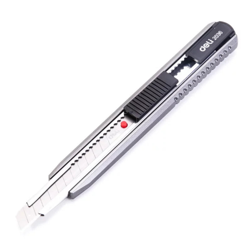 Cúter metálico pequeño DELI 2036 con bloqueo automático. Admite cuchillas de repuesto.