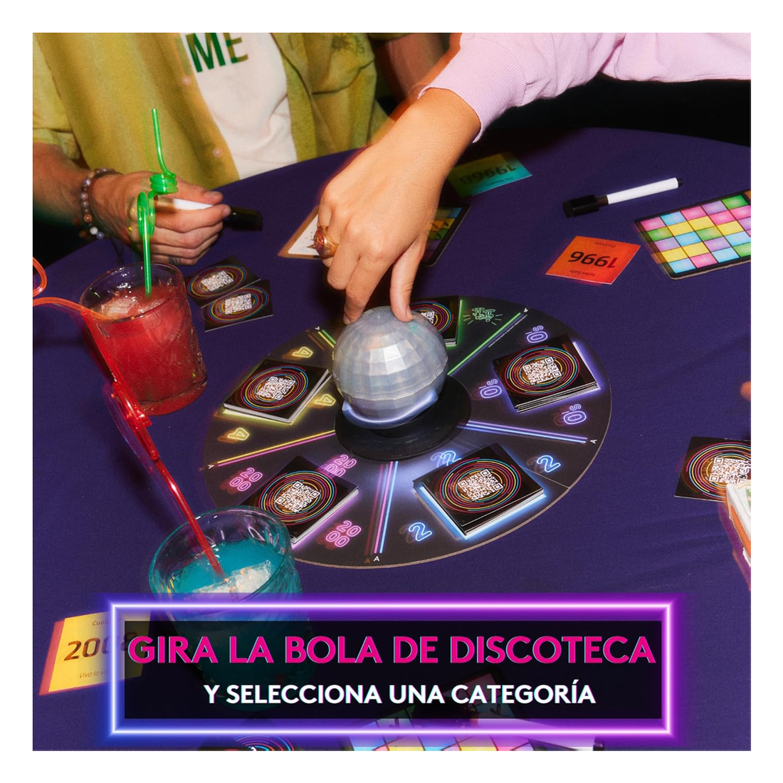 Prepárate para girar la bola de disco para revelar la categoría, escanea la tarjeta y deja que suene la música. Adivina la década, identifica cantantes o grupos, elige el año exacto o determina si es antes o después de la década de 2000.