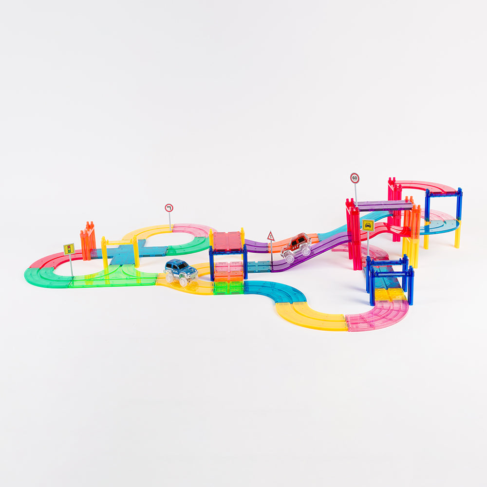 Prepárate para la máxima diversión y adrenalina con la pista de carreras 50 piezas de IMANIX! En primer lugar, este emocionante circuito magnético te ofrece un sinfín de posibilidades para crear y diseñar tus propias carreras. Además, puedes conectar las piezas magnéticas para construir curvas, rectas y emocionantes loopings.