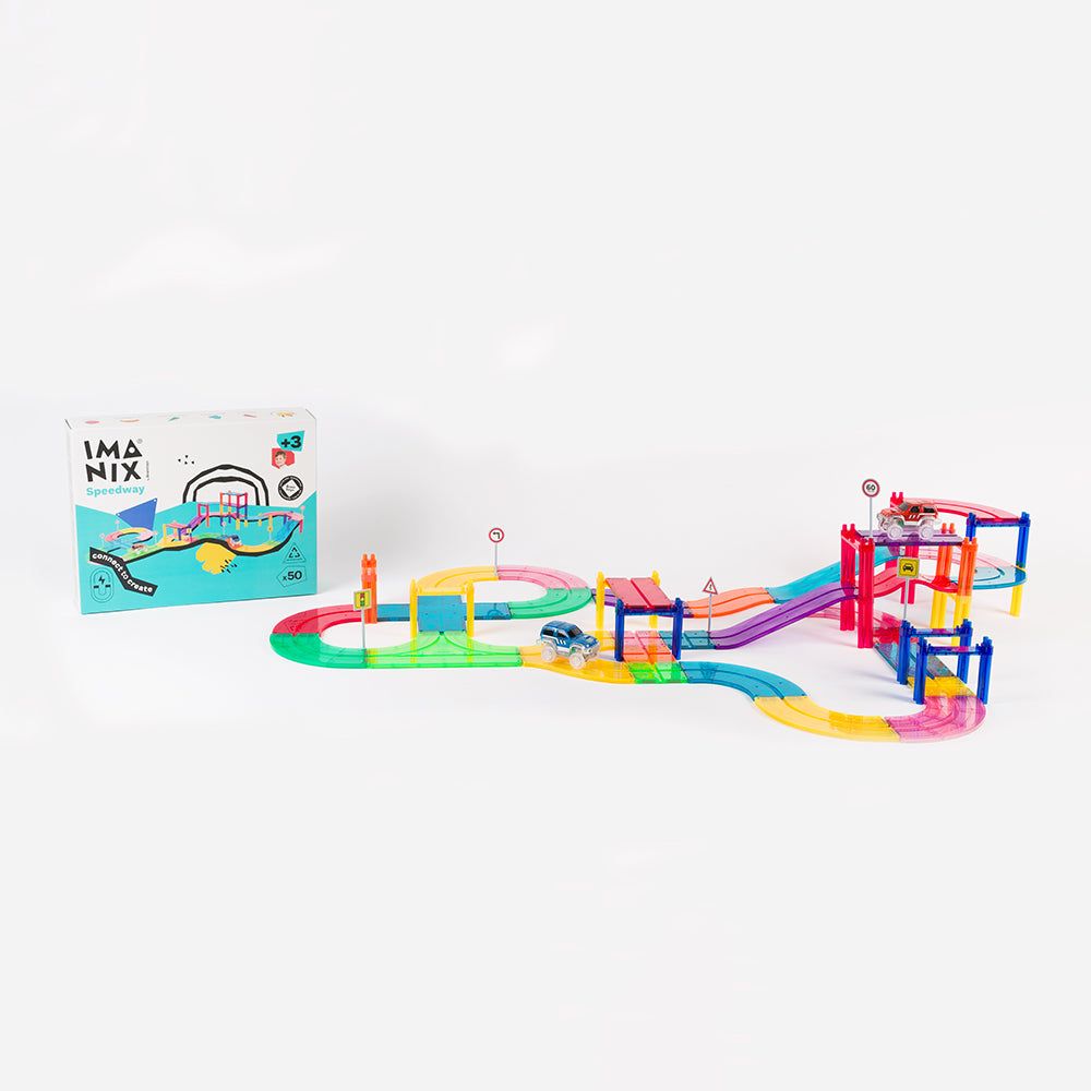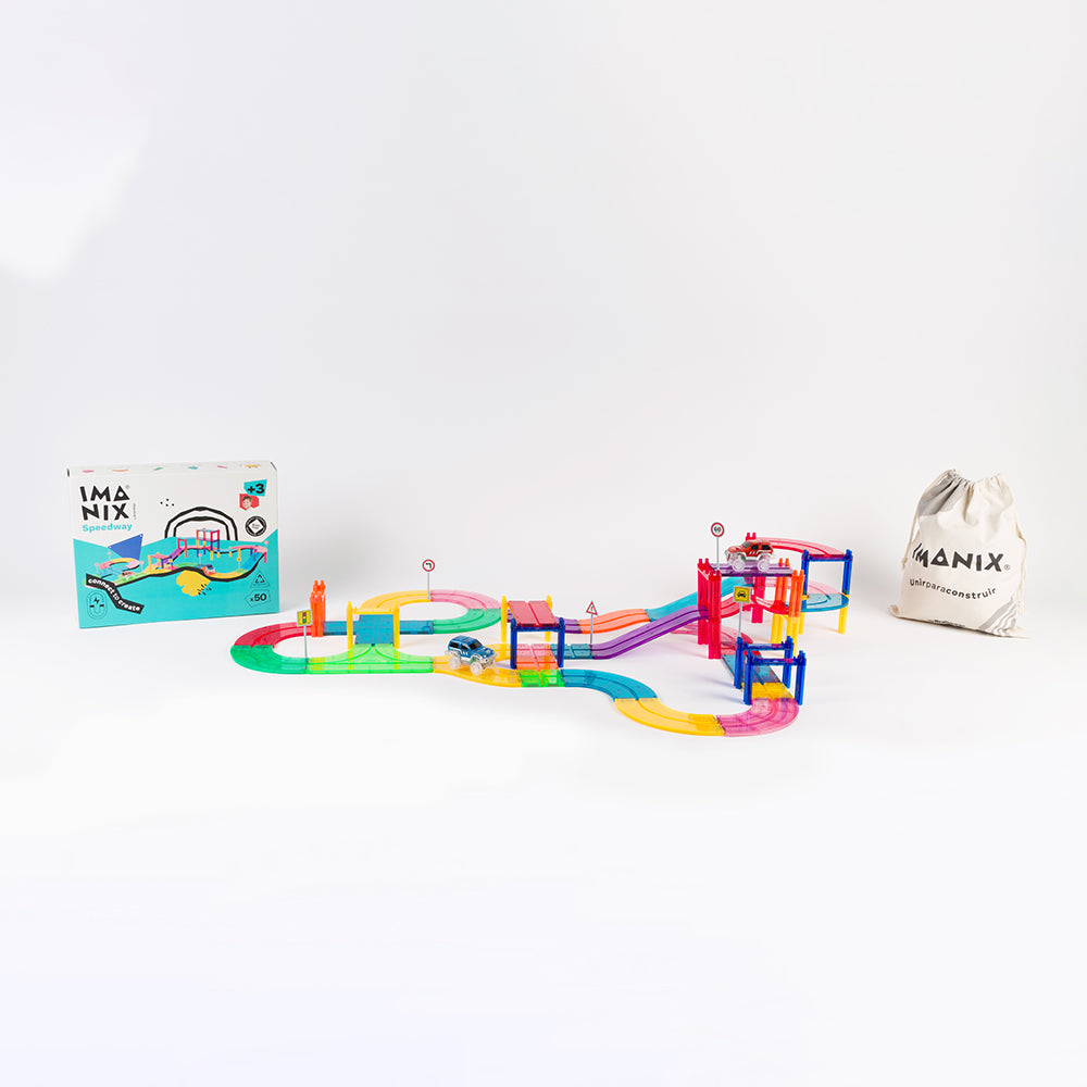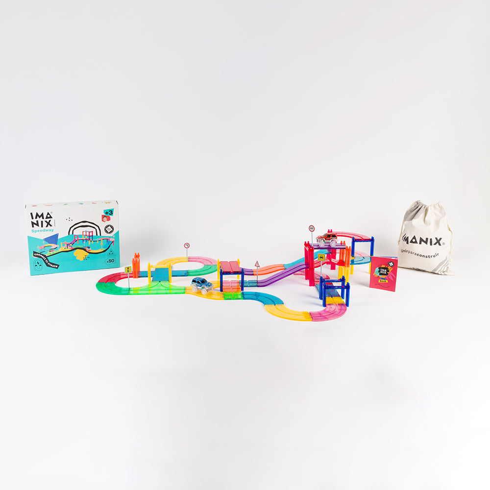 La diversión nunca se detiene con IMANIX y su pista de carreras de 50 piezas, de alto rendimiento. ¡Vive la emoción de las carreras como nunca antes lo habías hecho!